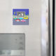 Pass the popcorn! This Small Town Drive-In Movie Magnet will transport you to a simpler time, when gas was cheap, rock and roll was young, and the movie stars of Hollywood's Golden Age shined brighter than the night sky. The design features the rear view of five, virtually indestructible, retro cars in colours of red, pink, turquoise, jade and yellow. In front of the cars is a giant movie screen, showing a black and white movie, featuring two, star-crossed lovers in hats and trench coats. In the background, there is a grey, picket fence, a row of green, cedar trees, a royal blue sky and a yellow, crescent moon. We hope you've enjoyed our feature presentation!