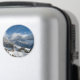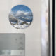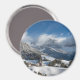Round photo magnet with the small village Sankt Magdalena in Villnoess valley with the Geisler Dolomites mountain peaks in the background covered in snow in winter season in South Tyrol, Italy.