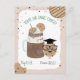 Illustration of an extreme milkshake topped with cookies, whipped cream, and chocolate syrup surrounded by cookies and confetti. Cookie with glasses and graduation cap stands beside milkshake.