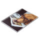 This adorable dog is sure to make you smile! She has on a pair of thick-rimmed black glasses while resting her head on a book (about dogs!).