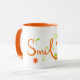 Start your day with a cheerful touch using this combo mug featuring a playful “Smile” brush-style illustration accented with leafy and floral details. The bright white exterior highlights the artwork beautifully, while the colored rim and handle add a fun pop of contrast. Perfect for coffee, tea, or gifting, this mug brings positive, creative energy to every sip.