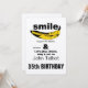 Graphic art: Banana orientated to form a smile + small text between brackets: (is good for health). Perfect for anyone who keeps smiling year after year. Design on rounded flat card invitation with texts for 35th Birthday party to customise. You can easily change text (font, colour, size and position) by clicking the customise button. This invitation is presented with a natural paper "Premium Kraft" and Eco-friendly but you can change this option. Matching birthday Save the Date, birthday guest books (hard cover and spiral notebook), birthday paper napkin, paper plate and more...