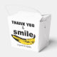 Graphic art: Banana orientated to form a smile + small text between brackets: (is good for health). Perfect for anyone who keeps smiling year after year. Design on take-out favour box with texts for 50th Birthday in front + Thank You in back to customise. You can easily change text (font, colour, size and position) by clicking the customise button. Matching birthday Save the Date, birthday invitation, birthday paper napkin, paper plate and more...