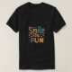 The t-shirt design features the text "Smile It's Fun" in bold, colourful letters. The letters are arranged in a playful, stacked layout with the words "Smile" and "Fun" at the top and bottom, respectively. The word "It's" is placed in between, using a smaller, contrasting font. The overall design is cheerful and eye-catching, with the bright colours and playful typography conveying a sense of fun and optimism.