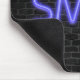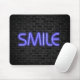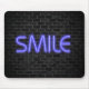 Illuminated urban brick wall with SMILE text in glowing purple neon lights.