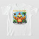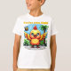 A joyful yellow chick with bright eyes and rosy cheeks spreads its wings with excitement. A friendly bee hovers nearby. Lush green palms and a blue sky create a warm tropical feel. The phrase "Smiles take flight" in yellow letters enhances the cheerful mood.