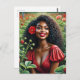Share a burst of beauty and joy with this stunning strawberry field postcard, featuring a radiant woman in a vivid red dress surrounded by lush green leaves, ripe strawberries, and bright blossoms. Her warm smile, thick curly hair, and the delicate flower tucked in her hair create a captivating portrait that celebrates both nature’s abundance and feminine elegance.