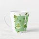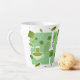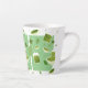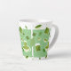 A latte mug with a pattern of smiling green teacups and bags with leaves on a green and white background. Add this fun, foodie, mug to your cart, so that you can enjoy it in your own home.