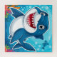 Cute artistic portrayal of a grinning blue shark in an underwater setting surrounded by vibrant coral.