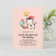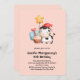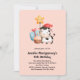 Birthday party invitation with an adorable image featuring a smiling cow, with a gold star balloon and some cake and a present.