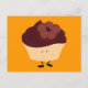 A smiling cupcake with chocolate frosting and a chocolate flower decoration