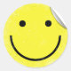 These stickers have a retro-looking yellow smiling face that has edges made to look like they are wrinkled. It also has one corner that looks like it is peeling off.