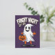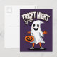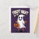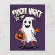 A cheerful and spooky Halloween postcard featuring a fun, cartoon ghost holding a bright orange jack-o'-lantern candy pail. The design uses a deep purple background with bold "FRIGHT NIGHT 31ST OCT" text. This vertical card is perfect for a friendly Halloween party invitation, a general seasonal greeting, or an announcement for a kids' trick-or-treat event. Its appealing, non-scary style is great for all ages.