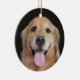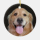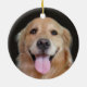 This ornament features a photograph of a smiling blonde golden retriever dog on a black background.