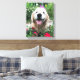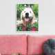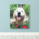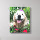 Add a little golden happiness to your home! This canvas print features a photograph of a cute, smiling golden retriever dog who is outside among red wild flowers.