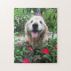 Smiling Golden Retriever Dog Among Red Flowers Jigsaw Puzzle