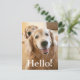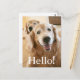 This postcard features a photograph of a smiling golden retriever dog, along with the word Hello!