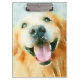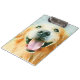 Let a happy dog bring a smile to your face! Design features watercolor portrait of a smiling golden retriever, on a blue background.