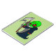 A cute and creepy cool looking illustration of the grim reaper death dude. Holding a scythe. He has a big skull, in bright neon green with glowing red eyes. Wearing a black robe, he has a toothy grinning smile showing off all his skeleton teeth.