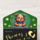 All in one gold foil "12th" birthday invitation featuring smiling happy Grizzly Bear DJ wearing large headphones and playing music on turntables. Music Jungle notes floating around. The perfect ..st birthday party invitation with fun music loving crowd with brown bear animation shinning sparks, glam from gold foil.