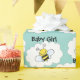 Smiling black and yellow honey bees buzzing over fluffy white clouds and a light pastel cyan background with customized with one or two lines of text for a baby girl or boy and personalized with a name or date to celebrate a cute baby shower or birthday.