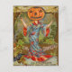 This woman is ready for a Halloween party. This vintage Halloween print depicts a woman with a jack o' lantern. A bat and candle are in the foreground.