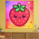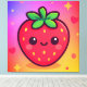 This adorable design features a single cartoon-style strawberry with a cheerful face, rosy cheeks, and expressive eyes. The strawberry is topped with vibrant green leaves and dotted with yellow seeds, set against a dreamy gradient background that transitions from soft pink to purple and yellow. Scattered hearts, stars, and dots add a whimsical and playful atmosphere, making the overall composition sweet and visually delightful.
