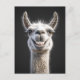 A highly detailed close-up of a smiling white llama with expressive eyes and a friendly, comical expression against a dark background.