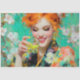 Bright, cheerful, and effortlessly chic—this decoupage tissue paper features a radiant redhead with a glowing smile, holding a lemon cocktail that perfectly matches her bold yellow nails. Surrounded by pastel blossoms and dressed in a floral print, this sunny design is ideal for springtime bar carts, party trays, DIY gift wrap, or craft projects bursting with happiness and retro charm.
