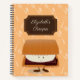 A recipe notebook with a smiling s'more cartoon character on a background of repeating cooking utensils. The cover shows the words "Elizabeth's Recipes" and those words can be customised.