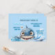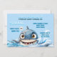 This adorable invitation features the cutest cartoon shark, smiling and swimming through the ocean waves against a pale blue background. Fun, different shades of blue and white text templates make it easy to customise with your party details.