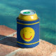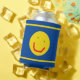 A green-eyed yellow sun smiling on a blue background. Add your own text on the reverse side. You may change the background colour, as well as the colour of the stripes and text.