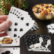 This deck of playing cards is black covered in white musical notes with a happy smiling fluffly white cat walking across piano keys while winking.