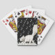 This deck of playing cards is black covered in white musical notes with a happy smiling fluffly white cat walking across piano keys while winking.