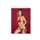 A swimsuit model poses confidently in a red bikini against a matching red background. Her expression is friendly and inviting.