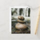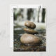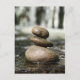 A closeup of a trio of smooth rocks stacked by a small pond's waterfall.