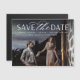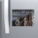 A modern save the date magnet designed to accommodate your favourite horizontal or landscape orientated full-bleed engagement photo. "Save the date" appears near the top of your photo in white block and script lettering, with your names, wedding date and wedding location beneath. Use the additional line of text to share your wedding website or additional details.