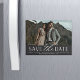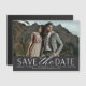 A modern save the date magnet designed to accommodate a single horizontal or landscape orientated engagement photo. "Save the date" appears beneath in chic block and script lettering, with your names, wedding date and wedding location beneath, along with your wedding website or additional details.