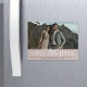 A modern save the date magnet designed to accommodate a single horizontal or landscape orientated engagement photo. "Save the date" appears beneath in chic block and script lettering, with your names, wedding date and wedding location beneath, along with your wedding website or additional details.