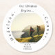 A modern save the date in a unique coaster format designed to accommodate your favourite engagement photo. "Our adventure begins..." appears at the top of your photo in black block and script lettering, with your wedding date and wedding location at the bottom. The names of the bride and groom appear to the left and right of the picture in a circle design. Use the additional line of text to share your wedding website or additional details. Change the colour of the font to match your photo or wedding colours.