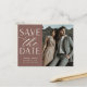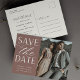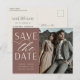 A modern save the date postcard designed to accommodate your favourite vertical or portrait orientated engagement photo. "Save the date" appears alongside your photo in off-white block and script lettering, with your names, wedding date and wedding location beneath. Postcards reverse to show additional save the date details, including your wedding website, with your return address and space for recipient addressing.