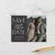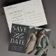 A modern save the date postcard designed to accommodate your favourite vertical or portrait orientated engagement photo. "Save the date" appears alongside your photo in off-white block and script lettering, with your names, wedding date and wedding location beneath. Postcards reverse to show additional save the date details, including your wedding website, with your return address and space for recipient addressing.
