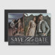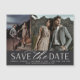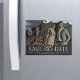 A modern save the date magnet designed to accommodate two engagement photos aligned side by side. "Save the date" appears beneath your photos in chic block and script lettering, with your names, wedding date and wedding location beneath, along with your wedding website or additional details.