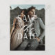 A modern save the date postcard designed to accommodate your favourite vertical or portrait orientated full-bleed engagement photo. "Save the date" is overlaid on the centre of your photo in white block and script lettering, with your names, wedding date and wedding location beneath. Postcards reverse to show additional save the date details, including your wedding website, with your return address and space for recipient addressing.
