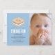 This cute and kawaii "S'more Fun" boy's 1st/first birthday photo invitation features a s'more with smiling face on a blue background. The reverse side features a white background with blue stripes. Personalise for your needs. You can find more matching products at my store.