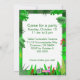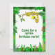 These invitations have a cute yellow cartoon snake coiled in a tree. It has brown spots on a yellow body and is smiling, with its fangs and tongue sticking out. The front of the invites say, "Come for a reptile birthday party." Change this message in the template.