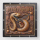 This dramatic square wall clock features a highly dimensional, close-up illustration of a large coiled brown and tan snake with an open mouth and a small, orange-brown rat standing next to it. The entire design is rendered in rich brown and dark wood tones, strongly suggesting a deep carved relief or Engraved Wood Look. The snake has detailed hexagonal scales and the rat has textured fur and is looking upward. They are positioned on a bed of small, rounded stones and pebbles in the foreground. The background is framed by highly detailed, dark brown, gnarled tree roots and leaves. The carving style gives the entire image a strong three-dimensional, sculpted quality. The large, three-dimensional embossed text "BESTIES FOR LIFE" is carved across the top. The clock face features a simple clock face border with large, white, numbered tick marks (1 to 12) integrated into the outer frame. The artwork is surrounded by a thick, dark brown decorative border that resembles a black wood frame.