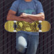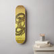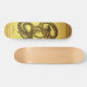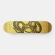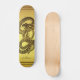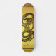 A unique skateboard featuring two snakes entangled and your name personalized in a script signature on a faux gold foil background. eye catching and bold.