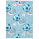 Boys' watercolor illustration featuring soccer balls, sneakers, and blue stripes.