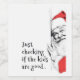 A humourous and unique holiday design featuring Santa peeking from behind a wall, saying "Just checking if the kids are good". Perfect for parents and anyone who enjoys playful, witty Christmas artwork. This creative illustration adds a touch of laughter and festive charm to any holiday setting, making it a delightful and one-of-a-kind seasonal design.